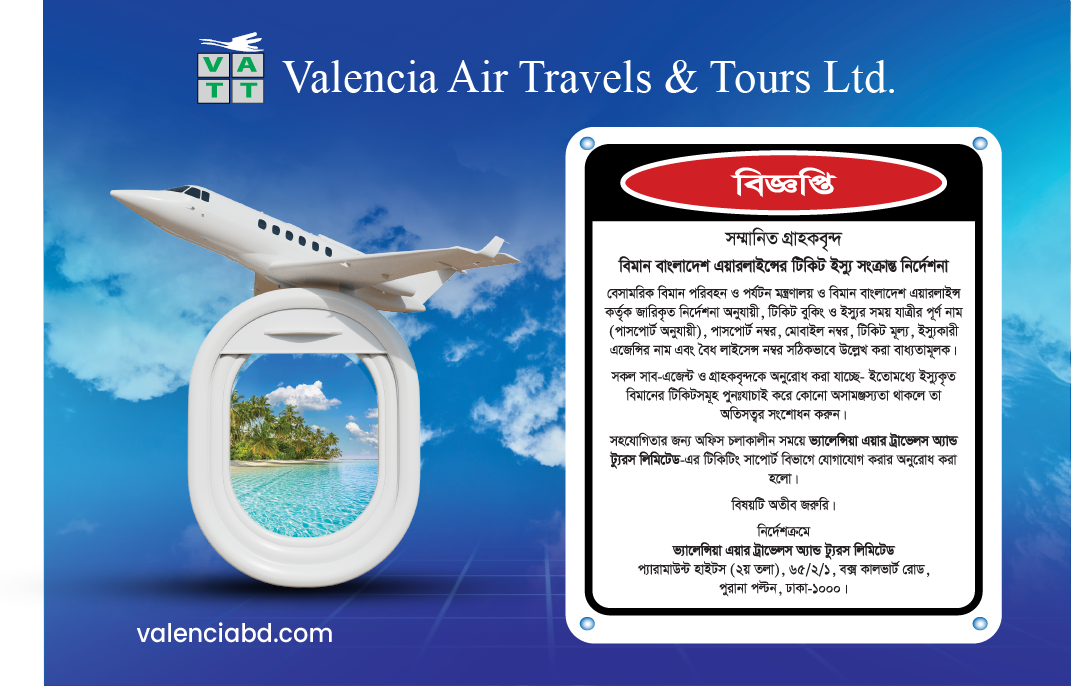 সহযোগিতার জন্য অফিস চলাকালীন সময়ে ভ্যালেন্সিয়া এয়ার ট্রাভেলস অ্যান্ড ট্যুরস লিমিটেড-এর টিকিটিং সাপোর্ট বিভাগে যোগাযোগ করার অনুরোধ করা হলো।